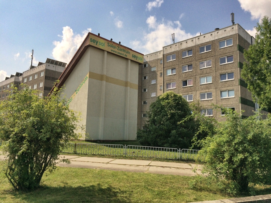 Nach dem Verlassen des Zubringers kommen Sie an einen großen Kreisverkehr in dessen Mitte ein großer Schiffspropeller liegt. Sie nehmen dann die zweite Abfahrt auf den „Frankendamm“ und fahren bis Sie auf der linken Seite die Filiale der Sparkasse sehen und biegen danach nach rechts in die „Gartenstraße“ ein. Auf der Gartenstraße (Achtung, Tempo -30 –Zone!) fahren Sie dann bis zum Solarzentrum (Bild unten). Unmittelbar nach dem Solarzentrum fahren Sie nach rechts auf das Grundstück „Gartenstraße 14“ und parken das Auto vor dem überdachten Haupteingang (mit großer Glastür) aus dem Parkplatz für die Anmeldung (siehe Bild unten).